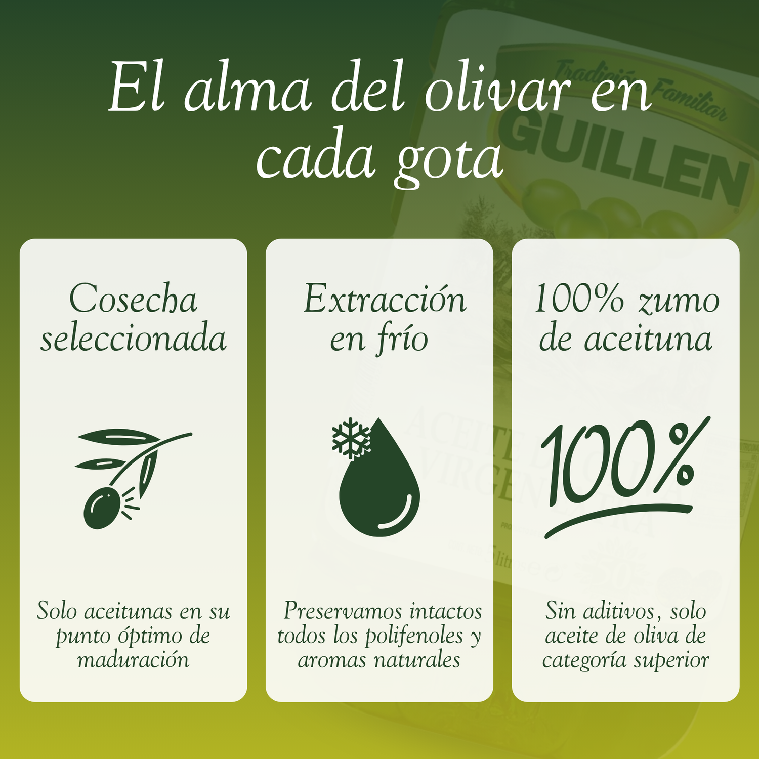 Nuestro Aceite de Oliva Virgen Extra Guillén es la esencia de la cocina mediterránea, aportando un sabor excepcional a cada plato. Ideal para aderezar, cocinar o incluso en repostería, es la elección perfecta para realzar tus recetas.