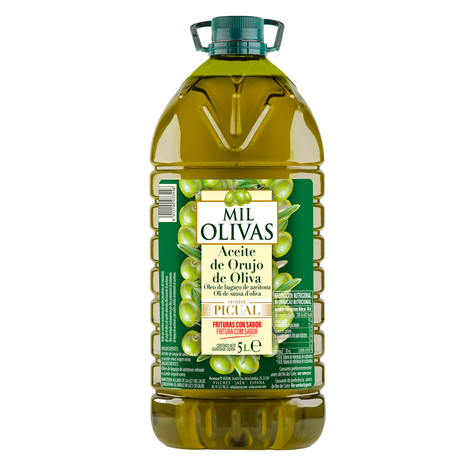 La distintiva tonalidad verde de nuestro aceite de orujo de oliva se debe a la elevada proporción de aceite de oliva que incorporamos en su elaboración. En este sentido, Mil Olivas es líder en el mercado, ofreciendo el mayor porcentaje de aceite de oliva en su categoría